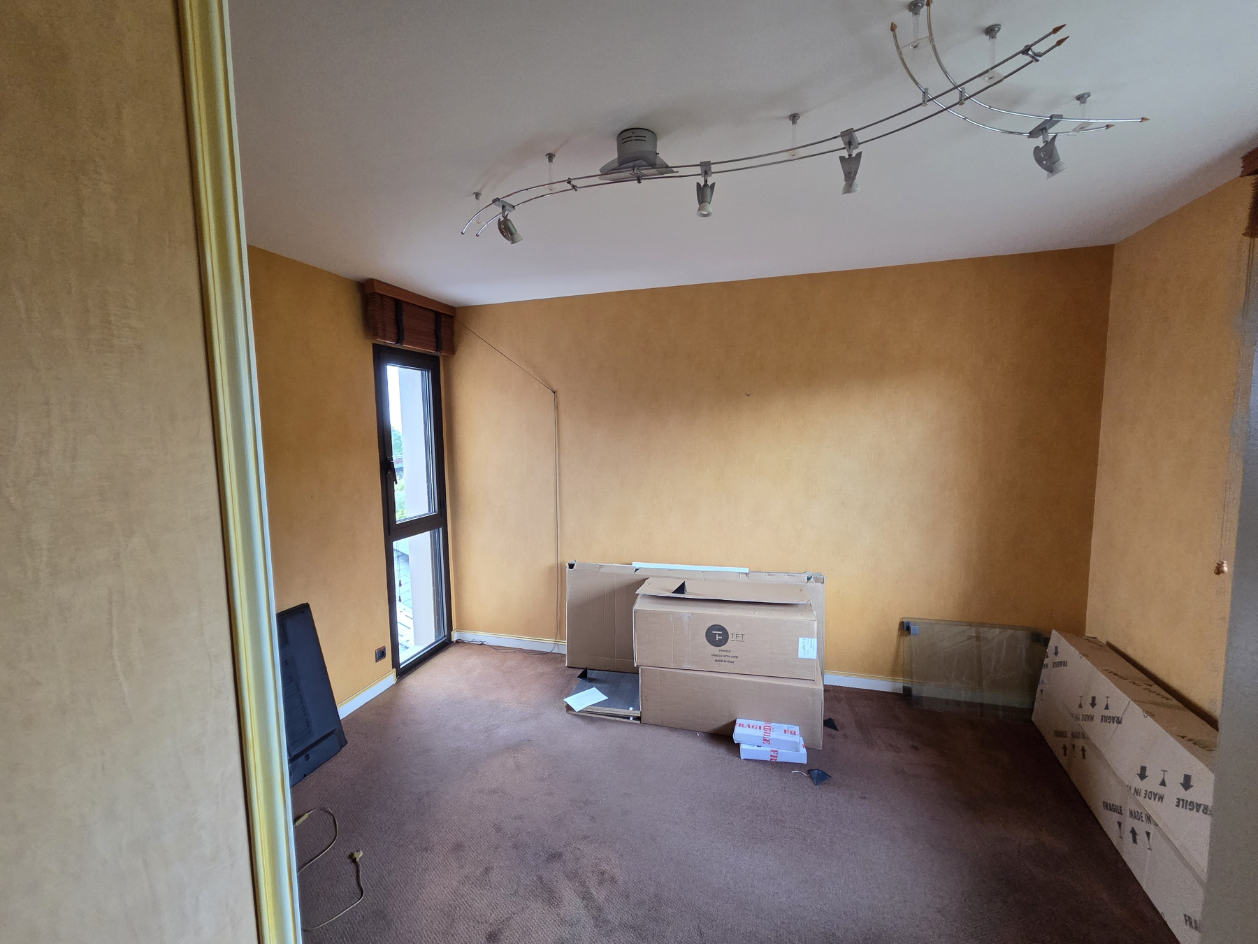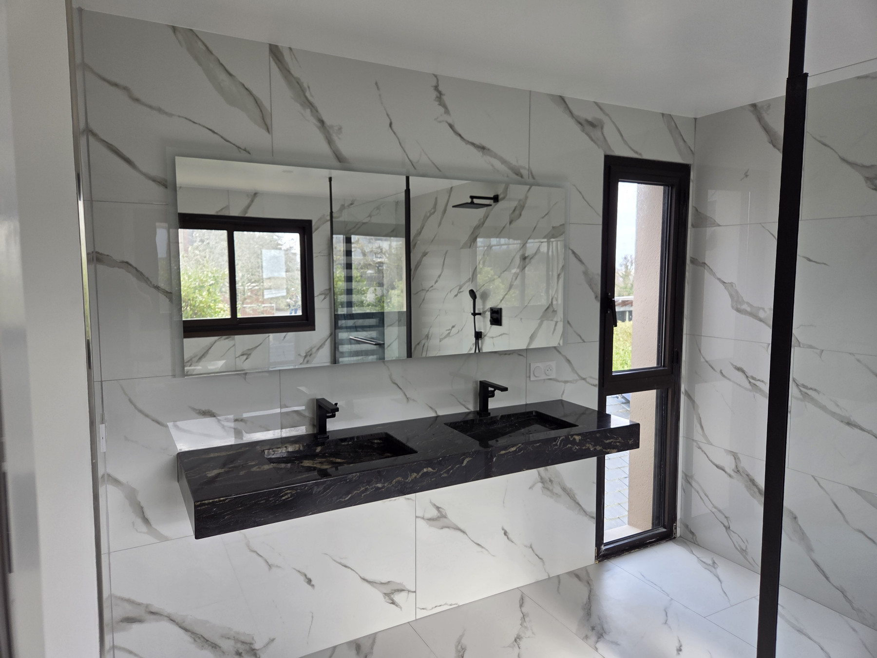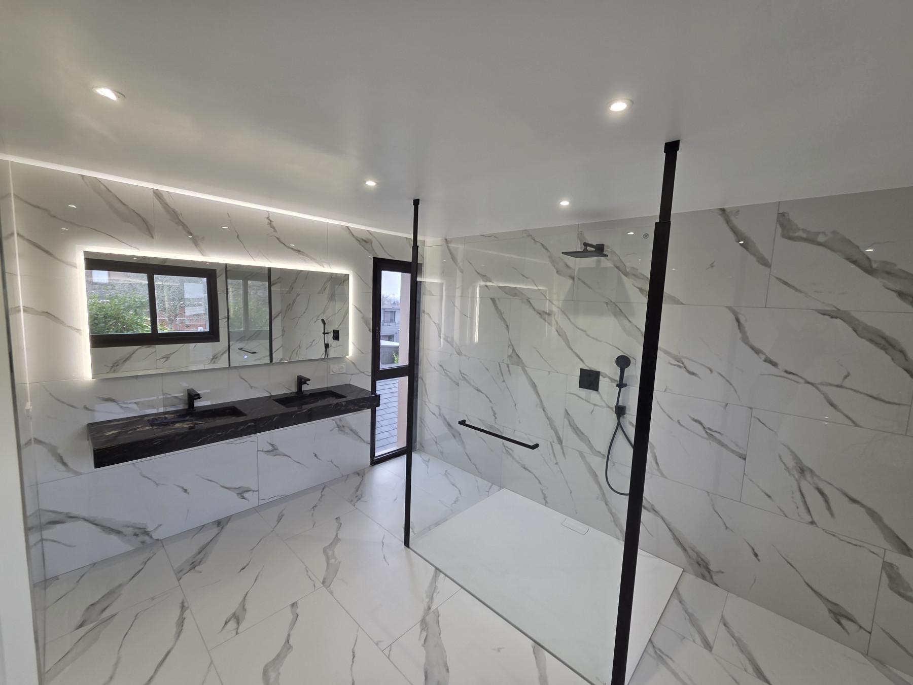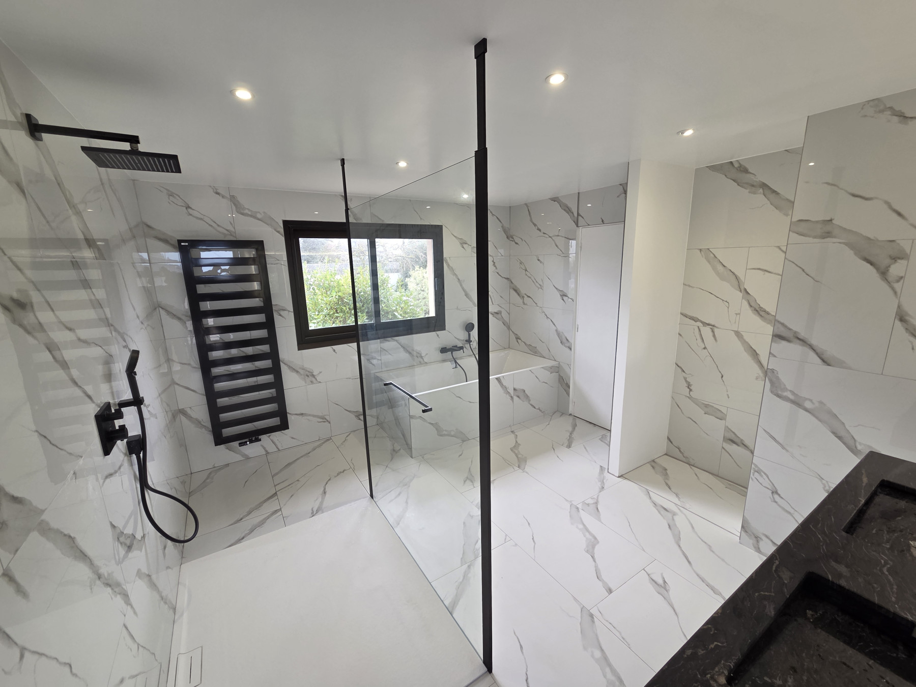 Création d'une salle de bain à la place d'un bureau avec douche, baignoire et double vasque. Revêtements sols et murs imitation marbre.